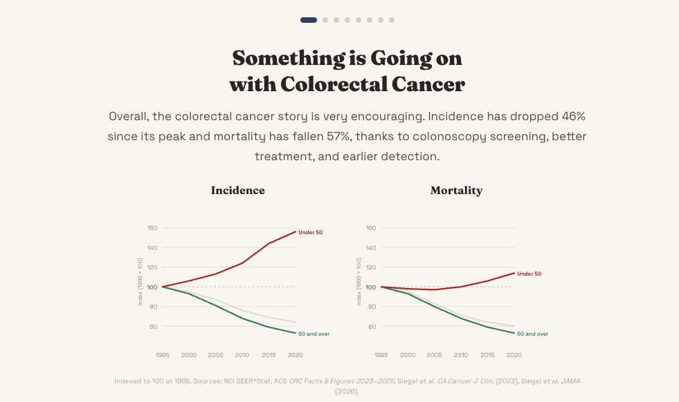 An interactive data journalism piece exploring the rise of young-onset colorectal cancer, with population simulations, risk factors, and prevention information. | |